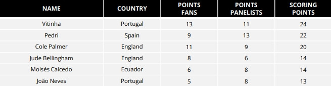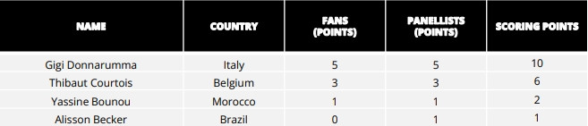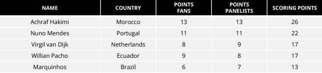 投票为(球迷投票+队长/教练/媒体组成的专家投票)赋分制,除门将外,在单个投票群体中得分最高的球员将被赋予13分,第二名被赋11分,以此类推。